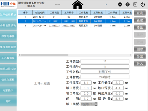 李榮團(tuán)隊(duì)開發(fā)了一套激光焊接裝備數(shù)字化控制系統(tǒng)人機(jī)界面軟件,對于提升設(shè)備整體的穩(wěn)定性和信息化程度意義重大。該軟件基于QT平臺使用C++語言編寫,在工控機(jī)運(yùn)行顯示,通過外接鍵盤來輸入?yún)?shù),手動或者自動執(zhí)行焊接操作。具備生產(chǎn)信息、生產(chǎn)數(shù)據(jù)監(jiān)控、參數(shù)設(shè)置、歷史數(shù)據(jù)追溯及數(shù)據(jù)處理、報(bào)警及維護(hù)、監(jiān)控顯示、信息化看板等主要功能模塊。基于MYSQL建立工藝數(shù)據(jù)庫,工藝數(shù)據(jù)與工件信息和操作人員相匹配,實(shí)現(xiàn)信息的存儲、分類整理和統(tǒng)計(jì)分析,并能夠?qū)崿F(xiàn)與上層企業(yè)信息管理系統(tǒng)的互聯(lián)互通,企業(yè)可隨時(shí)導(dǎo)出需要的生產(chǎn)數(shù)據(jù),方便企業(yè)進(jìn)行生產(chǎn)規(guī)劃、生產(chǎn)進(jìn)度管理和產(chǎn)品質(zhì)量追溯,推動企業(yè)向數(shù)字化工廠發(fā)展。