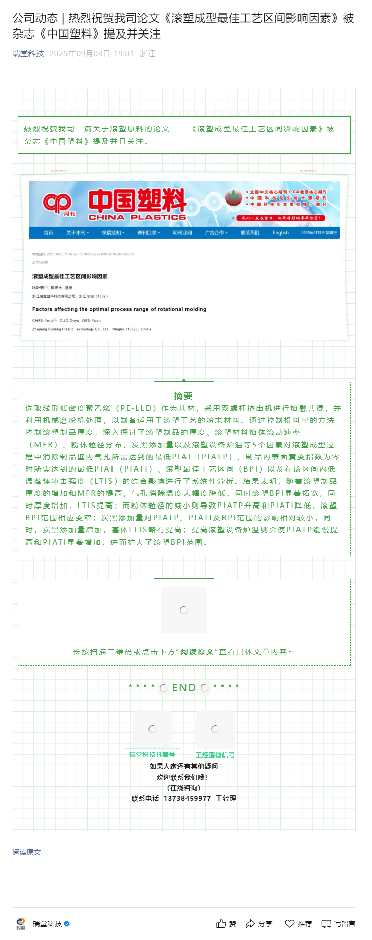 公司動態(tài) _ 熱烈祝賀我司論文《滾塑成型最佳工藝區(qū)間影響因素》被雜志《中國塑料》提及并關(guān)注